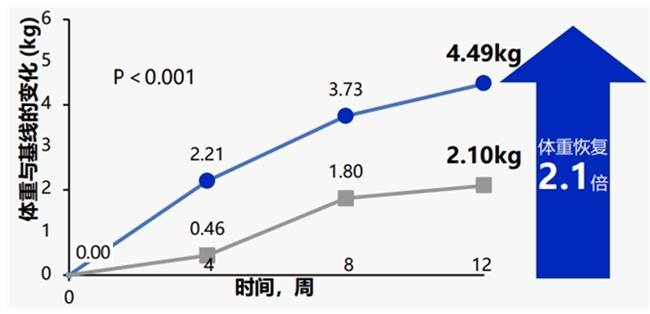 3.治疗疗效更强:临床数据显示,用药12周后,患者平均体重增加4.49kg,是普通甲地孕酮分散片的2.1倍[5]。
