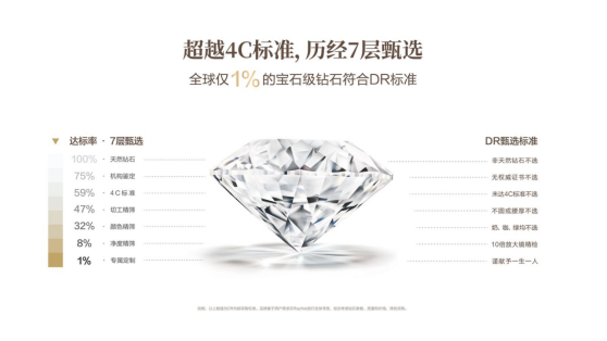 作为婚戒的灵魂,钻石的品质无疑是甄选的重中之重。而在众多珠宝品牌中,DR的钻石挑选标准堪称严苛。除了业界普遍认可的评判标准4C原则,即克拉重量、净度、颜色和切工外,DR还设立了独立的评价体系——“非天然钻石不选、无权威证书不选、未达4C标准不选、不圆或腰肥不选、奶咖绿不选、10倍放大镜精检、谨献予一生一人”,每一枚DR钻石,都需要经历7层严格甄选,据悉,全球也仅有1%*的宝石级钻石符合DR的标准,足见其品质之上乘。