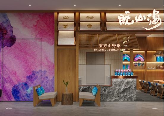 推开门,首先撞入眼帘的是充满东方韵味的空间设计:原木材质的框架勾勒出山水的轮廓,水墨质感的装饰画晕染出云海山林的意境,粉紫与青绿的色彩碰撞,既带着山野的灵动,又藏着东方美学的雅致。柜台处的大理石纹理似山峦叠嶂,座椅旁的蓝白靠枕如云海翻涌,每一处细节都在呼应“山海”的品牌内核,让整个空间仿佛成了微缩的东方山水画卷。