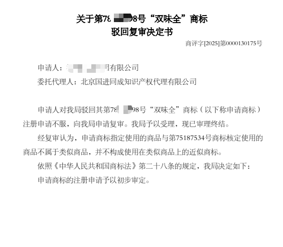 在第78XXX598号“双味全”商标驳回复审案中,国进同成团队再次展现了其专业价值。面对商标局的驳回决定,团队没有轻易放弃,而是深入研究申请商标与引证商标所指定的商品类别。经过精准比对与法律论证,团队成功向国家知识产权局阐明,申请商标指定使用的商品与引证商标核定使用的商品不属于类似商品,因此两者并不构成使用在类似商品上的近似商标。这一精准的法律意见被复审机关采纳,最终使“双味全”商标获得初步审定。此案充分凸显了国进同成团队基于《类似商品和服务区分表》及审查实践,进行精准法律分析和有效说服的能力。