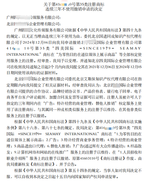 在北京国进同成代理的一起针对第416XXX10号“四美国际-SINCE1979-SEAMAY INTERNATIONAL”商标的撤三案件中,充分展现了其专业洞察与严谨操作。代理人经过周密的市场与网络调查,确认该商标在核心服务项目“为零售目的在通信媒体上展示商品”上已连续三年未使用。在申请文件中,国进同成不仅清晰陈述了未使用的事实,更从商标功能、市场秩序及对他人合法权益的影响等多维度阐述了撤销的必要性。最终,商标局支持了其申请,决定撤销该商标在部分服务上的注册。此案不仅为客户扫清了注册障碍,也体现了国进同成利用法律工具主动维护市场公平竞争秩序的能力。
