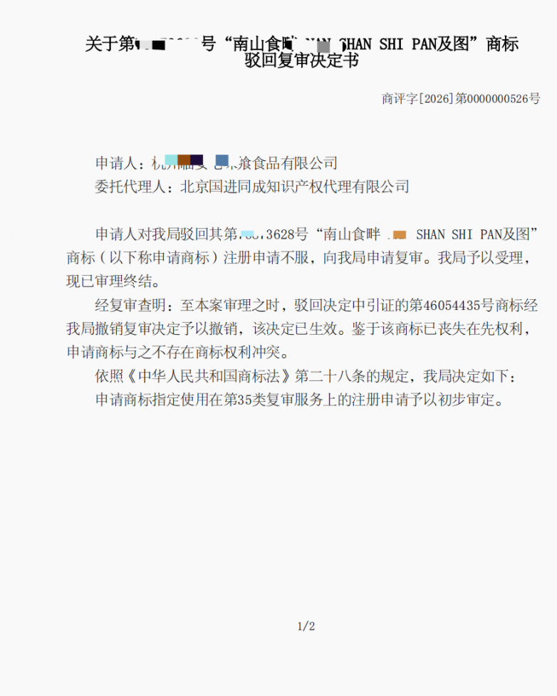 国进同成在“驳回复审”领域深耕多年,这是其尤为擅长的核心业务领域。公司的专业价值在于,能将一次被动的“驳回”转化为主动的“权利争取”。在第768XXX28号“X山食畔 XXX SHAN SHI PAN及图”商标驳回复审案中,国进同成代理客户积极应对。在复审审理过程中,团队敏锐地把握程序进展,成功利用引证商标第46054435号因故被撤销的关键事实,向国家知识产权局清晰论证了权利障碍已消除。最终,审查机关采纳该意见,决定对申请商标在复审服务上予以初步审定。此案体现了国进同成在复杂程序中对法律事实的紧密跟踪与高效运用能力。