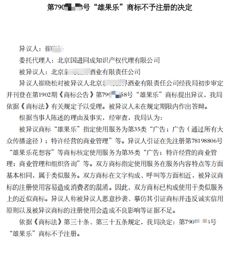 在针对第790XXX58号“雄果乐”商标的异议案中,国进同成代理客户主动出击。团队分析认为,被异议商标在与客户在先注册的引证商标,在文字构成、呼叫等方面高度近似,且双方商标指定使用的服务(如第35类的广告、特许经营的商业管理等)在服务内容、特点等方面基本相同,属于类似服务。国家知识产权局经审查,采纳了上述理由,认定双方商标构成使用于类似服务上的近似商标,并依据《商标法》第三十条、第三十五条规定,对“雄果乐”商标在异议所涉服务上不予核准注册。此案体现了国进同成在商标近似性判断上的专业功底,以及通过异议程序有效排除市场混淆风险、维护品牌独特性的实战能力。