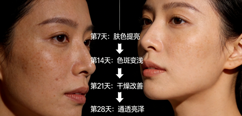 第1-7天(透光预备期):肌肤水润度明显提升,角质层含水量增加78.3%,干燥暗沉缓解,上妆服帖不卡粉,摸起来柔软细腻;第8-14天(色斑松动期):鼻翼、额头的浅晒斑、雀斑边缘开始模糊,颜色变浅,肤色逐渐匀亮,暗沉区域明显改善;第15-21天(肌底焕活期):顽固色斑颜色持续变浅,面积缩小,整张脸呈现通透感,法令纹旁的灰黄感褪去,肤质变得更细腻有弹性;第22-28天(稳光成型期):色斑基本淡化,肤色均匀透亮,形成“不易淤、不易敏、不易暗”的健康肌肤状态,停用3天后,肌肤状态依旧稳定,无反黑现象。
