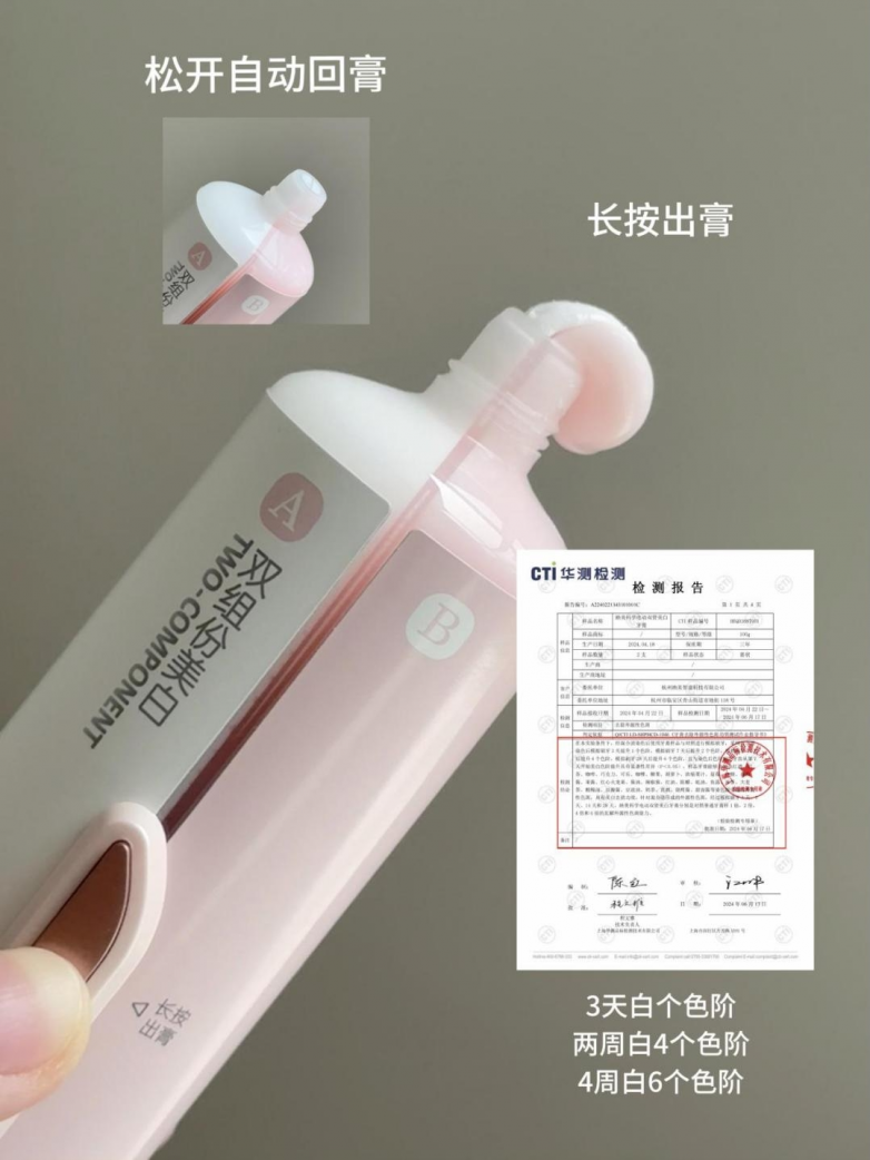 纳美科学的颠覆性思路始于对“成分鲜活度”的有效解决,双管双组份设计将活性美白成分(含过氧化氢+三醋精等核心成分)与美白催化成分(含氟化亚锡+小苏打等核心成分)物理隔绝,分仓真空锁鲜,直至使用前互不干扰,牢牢锁住各自的巅峰活性。